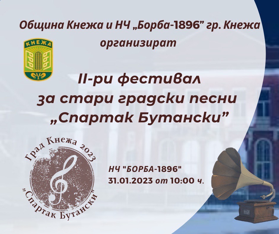 Община Кнежа и НЧ „Борба-1896” гр. Кнежа организират за втора година фестивала за стари градски песни „Спартак Бутански“, в чест на 103-годишнината от рождението на нашия скъп съгражданин - големия композитор и поет Спартак Бутански!
